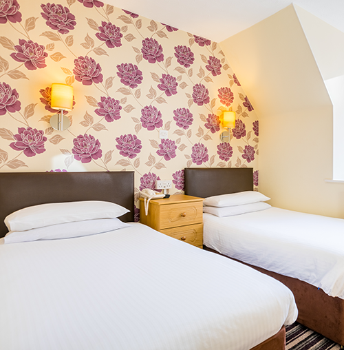 Twin rooms are the same size as double rooms but with 2 single beds. They benefit from en-suite bathrooms and all amenities included in the double rooms.